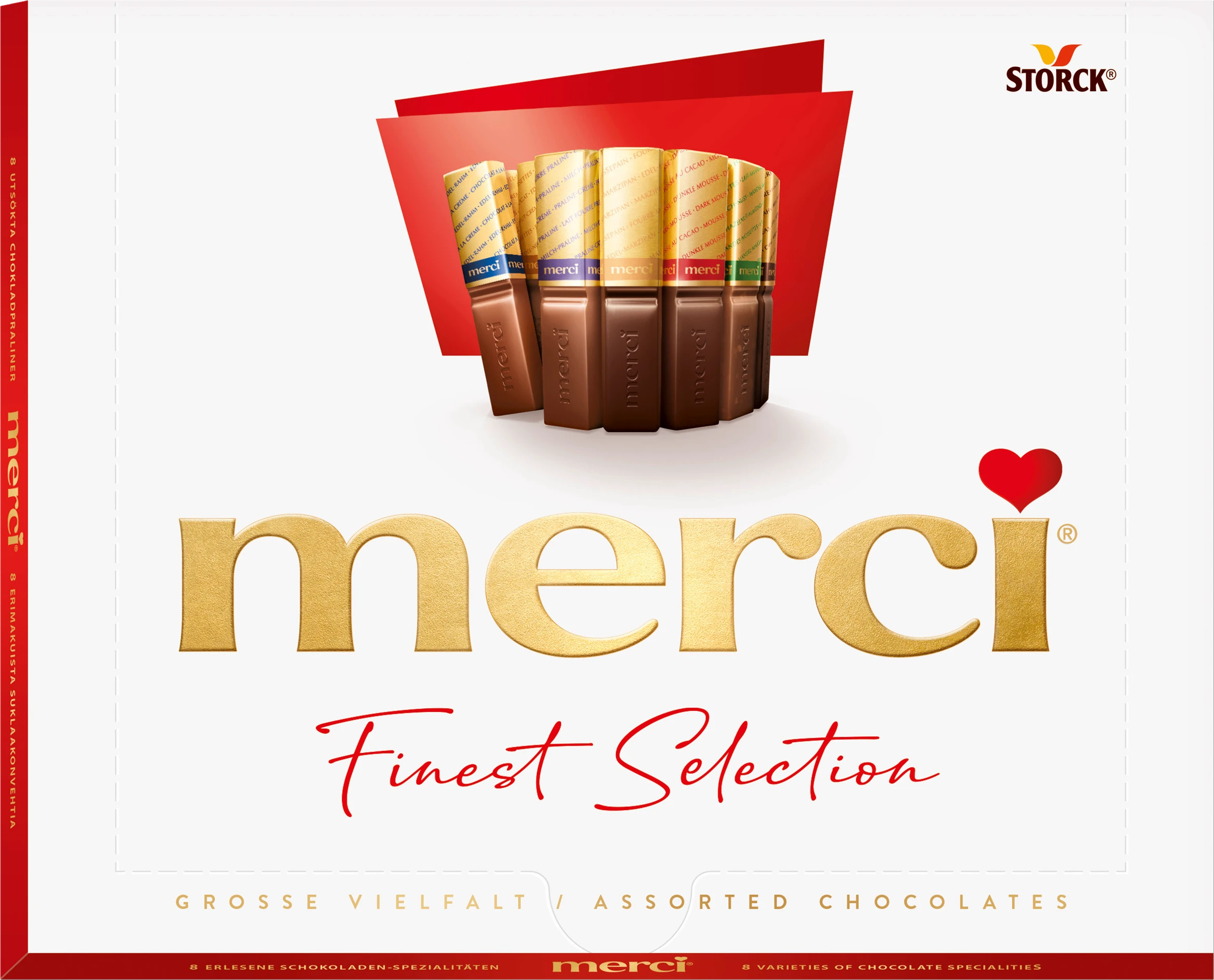 Heerlijke chocoladereepjes, gemaakt van de beste ingrediënten en per stuk verpakt in een gouden wikkel: zo vindt merci sinds 1964 in Duitsland en sinds 1979 in Nederland, rechtstreeks de weg naar de harten van de mensen.